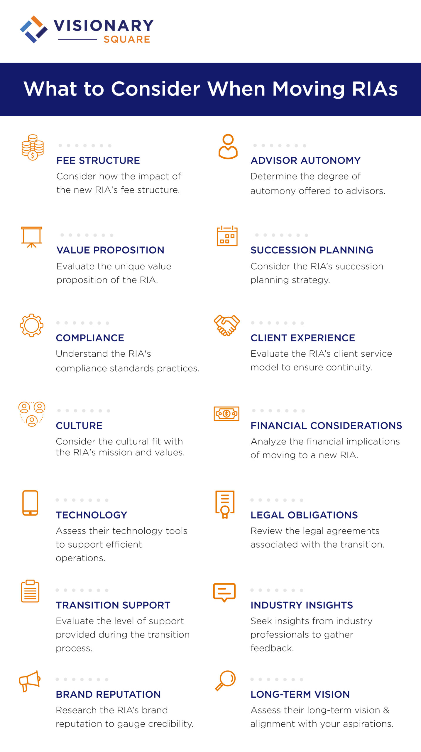 Assess the fee model of the new RIA, including whether it’s based on AUM, flat fees, or a combination. Consider how the fee structure impacts your revenue and client relationships.